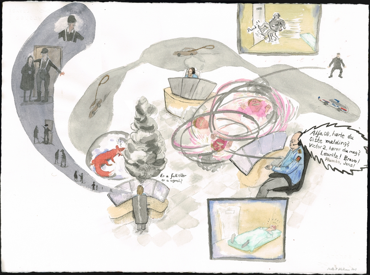 Blyant, akvarell og tusj på papir