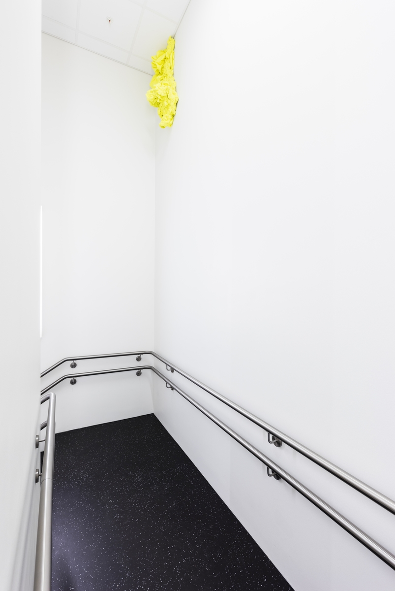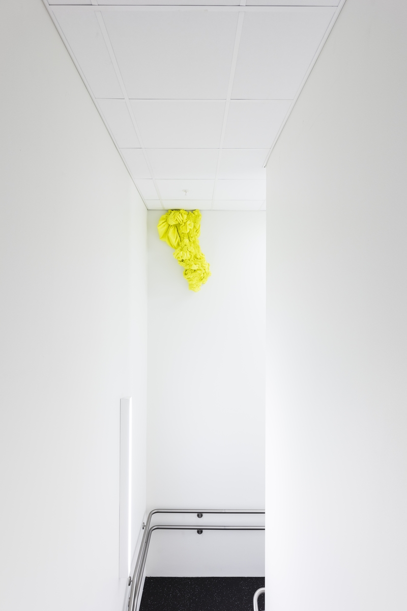 Den gule neonfargen er velkjent i politiet og varsler om oppmerksomhet. Kunstverket er montert i møtet mellom tak og vegg, slik at den nærmest renner nedover veggen, og lyser opp i oasen og gi energi.