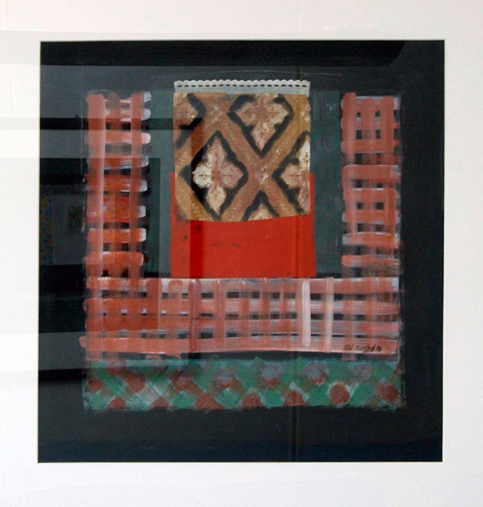 Collage av papir, blondetekstil og gouachemaling