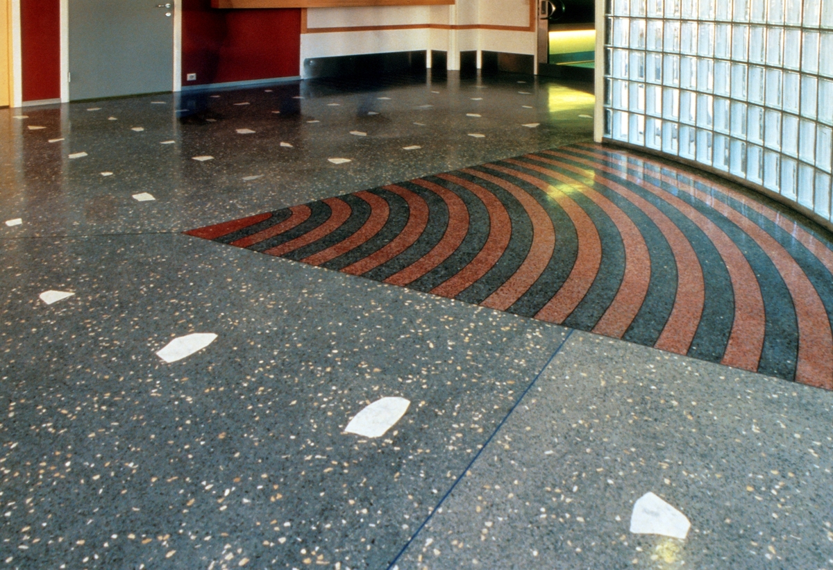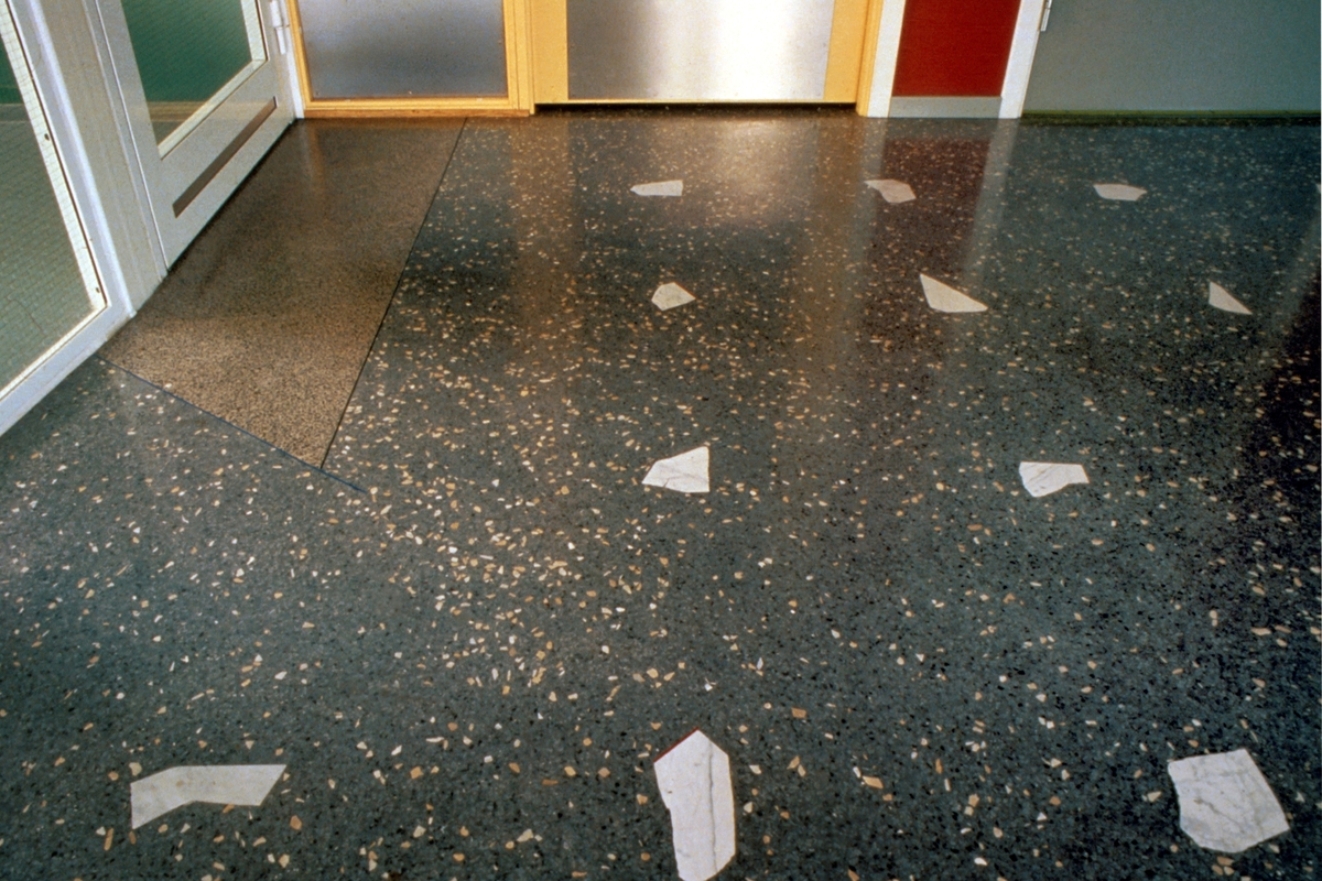 Flislagt gulv med terrazzo, mindre former av hvit marmor nedfelt i enkelte av flisene