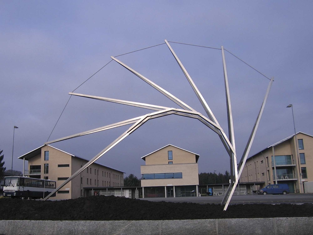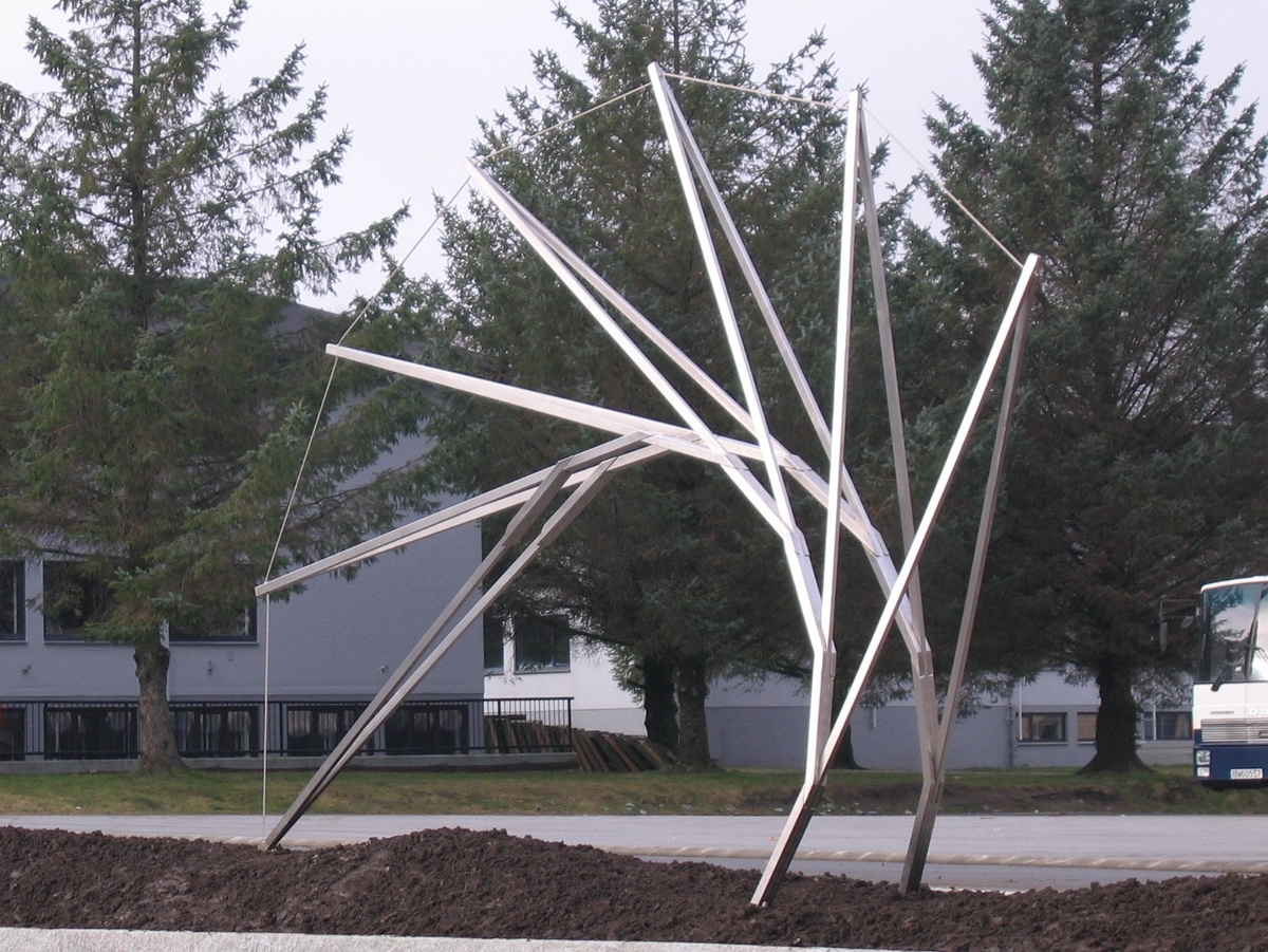 Konstruksjonsmåten står for letthet og dynamikk. Syv smale trekantformer er hektet i hverandre og holdes på plass av en spent stålvire slik at det oppstår et vifteformet hjul som er rettet ut mot veikanten. Hjulet danner en åpning som er stor nok til at et menneske kan passere gjennom, og danner et vindu inn til en stor plass for den som nærmer seg fra syd.
