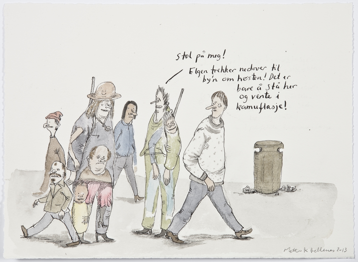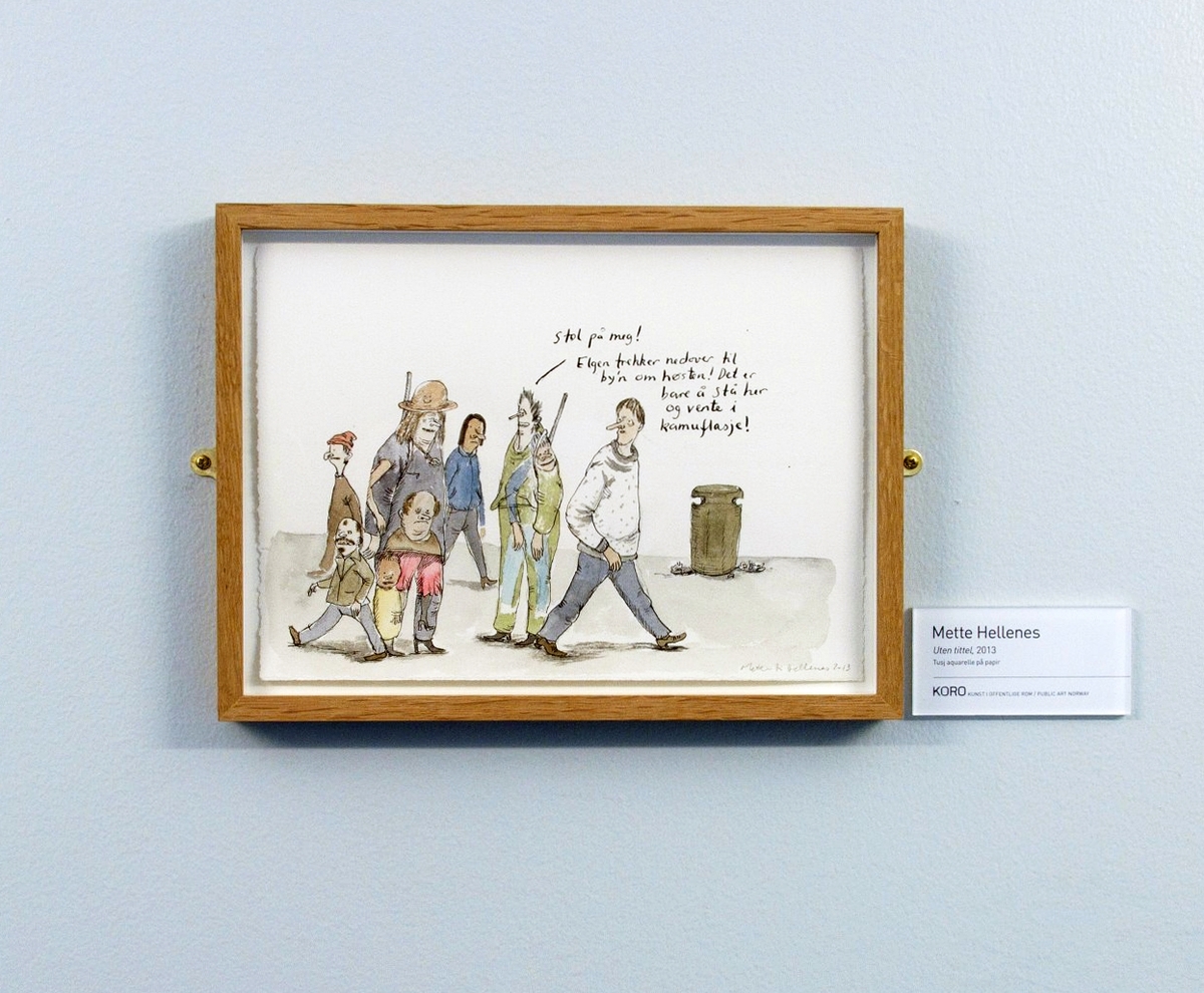 Til saman 18 teikningar av seks kunstnarar er kjøpt inn til dei seks forlegningane. Dei seks har ulike formspråk, men alle har eit blikk for både det heimlege og det storpolitiske. Mette Hellenes har i fleire år bruka to karakterar i teikningane sine: to vaksne kvinner som tilsynelatande liknar henne sjølv og venninna Vanessa (basert på Vanessa Baird). Dei to raljerer med fordommane våre, om det er byen sett frå landet eller «folk flest» sett frå kunsten. Streken er mjuk, men orda harde.
