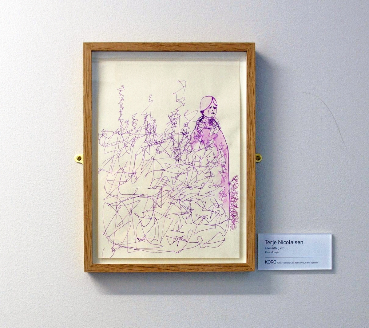 Til saman 18 teikningar av seks kunstnarar er kjøpt inn til dei seks forlegningane. Dei seks har ulike formspråk, men alle har eit blikk for både det heimlege og det storpolitiske. Kva er kunst? spør teikningane til Terje Nicolaisen. Ved fyrste blikk kan dei sjå ut som noko ein sjølv kunne teikna. Ved nærare ettersyn ser ein at dei rommar meir. På eitt av bilda står eller ligg ein gut med hovudet bakover, men det er vanskeleg å seie om han søv eller er vaken, om han er ven eller motstandar, eller om han i det heile tatt er i live.