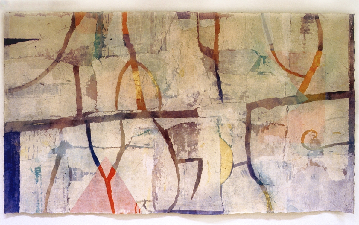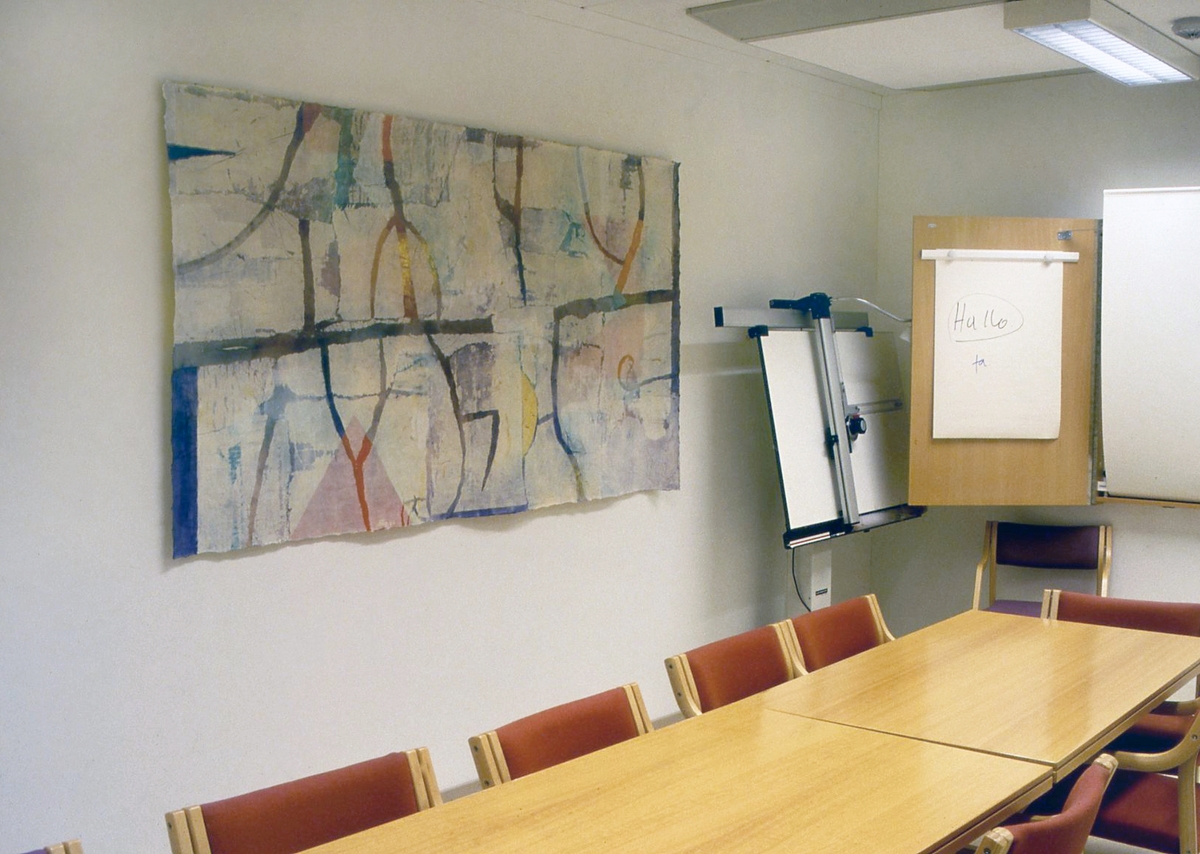 Silketrykkmaling og tekstilfarge malt og trykt på bomullslerret og laminert silkepapir